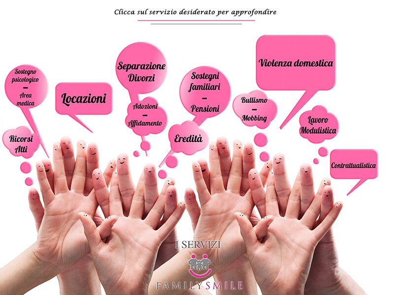 Family Smile parla a tutta le famiglie, tradizionali o di fatto, e affronta in maniera professionale e qualificata tutte le difficoltà che una famiglia si trova ad affrontare, nella gestione di ogni suo componente, dai più piccini ai più grandi. La nostra professionalità, e la passione per certe tematiche, ti permetterà di essere ascoltato, consigliato ed assistito nella ricerca di una giusta soluzione anche attraverso l’individuazione di consulenti in tutte le materie, accuratamente selezionati. I tesserati Family Smile potranno analizzare anche i temi più complessi e delicati insieme ad uno specialista che, con certificata professionalità, li ascolterà nel modo giusto, e con il supporto, se necessario, di prestazioni di qualità a prezzi assolutamente vantaggiosi. Family Smile offre ogni servizio utile a risolvere i problemi della tua famiglia, assicurando la massima professionalità ed il giusto approccio solidale. Family Smile promuove anche studi di settore, corsi di formazione, organizza campagne di sensibilizzazione sulle tematiche più significative che interessano le famiglie, anche in collaborazione con le Istituzioni pubbliche e associazioni private che al meglio rappresentano tale realtà nel nostro paese. Family Smile svolge, inoltre, attività di pubbliche relazioni al servizio degli utenti e dei consulenti sempre al fine di migliorare il servizio alle famiglie.